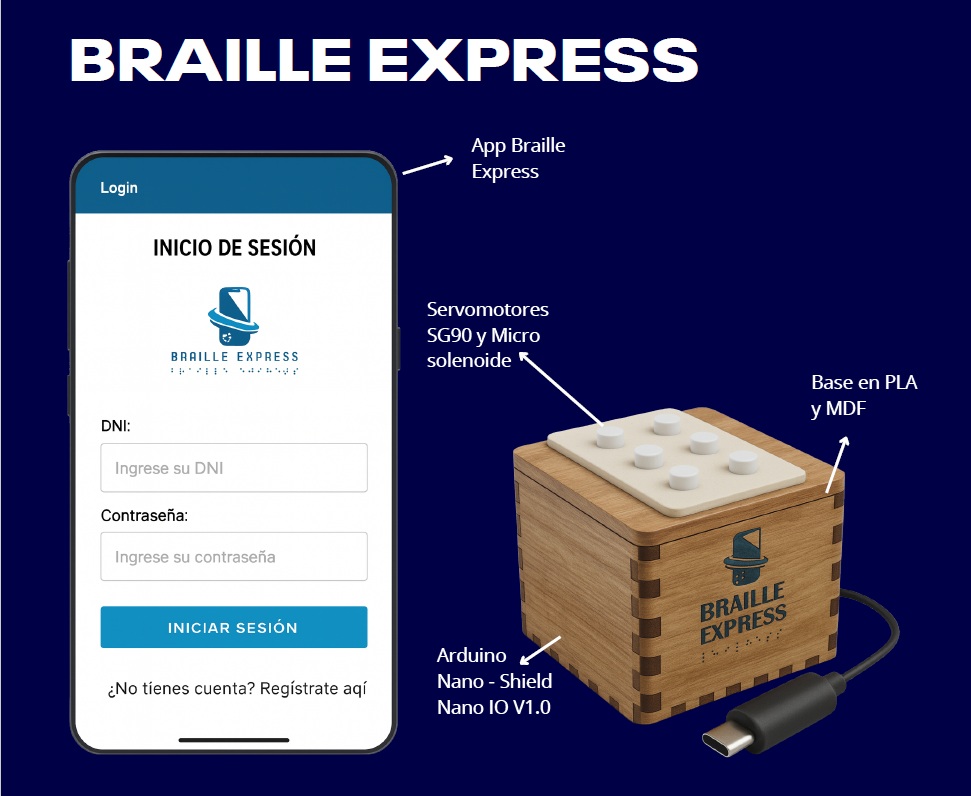 Braille Express funciona a través de un dispositivo que emplea un Arduino Nano y seis servomotores, los cuales reproducen los puntos del sistema Braille según el texto ingresado o dictado por voz. De esta manera, los usuarios pueden leer el contenido utilizando la yema de los dedos, sin necesidad de impresiones físicas.